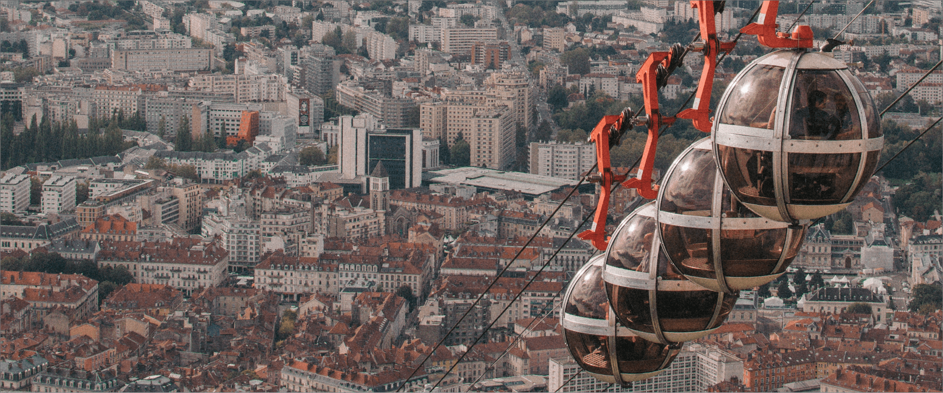 Exprimer graphiquement que nous parlons de Grenoble, check ! Comment ? Nos graphistes ont recréé le décor grenoblois, avec en arrière-plan les montagnes qui entourent la ville. La capitale des Alpes est encerclée notamment par la Chartreuse et le Vercors, pour n’en citer que deux.
