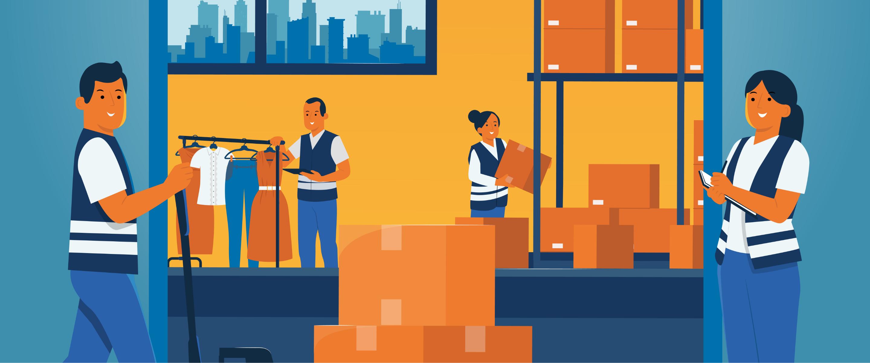 Chaque illustration incarne une facette du métier avec une approche graphique cohérente et colorée qui donne du relief au territoire de marque. L’entrepôt est toujours au centre du visuel, mais on rentre cette fois-ci dedans, pour mettre en valeur les différents savoir-faire des équipes. Les visuels attirent l’œil, quel que soit leur support de diffusion : presse spécialisée, brochures, kakemonos…